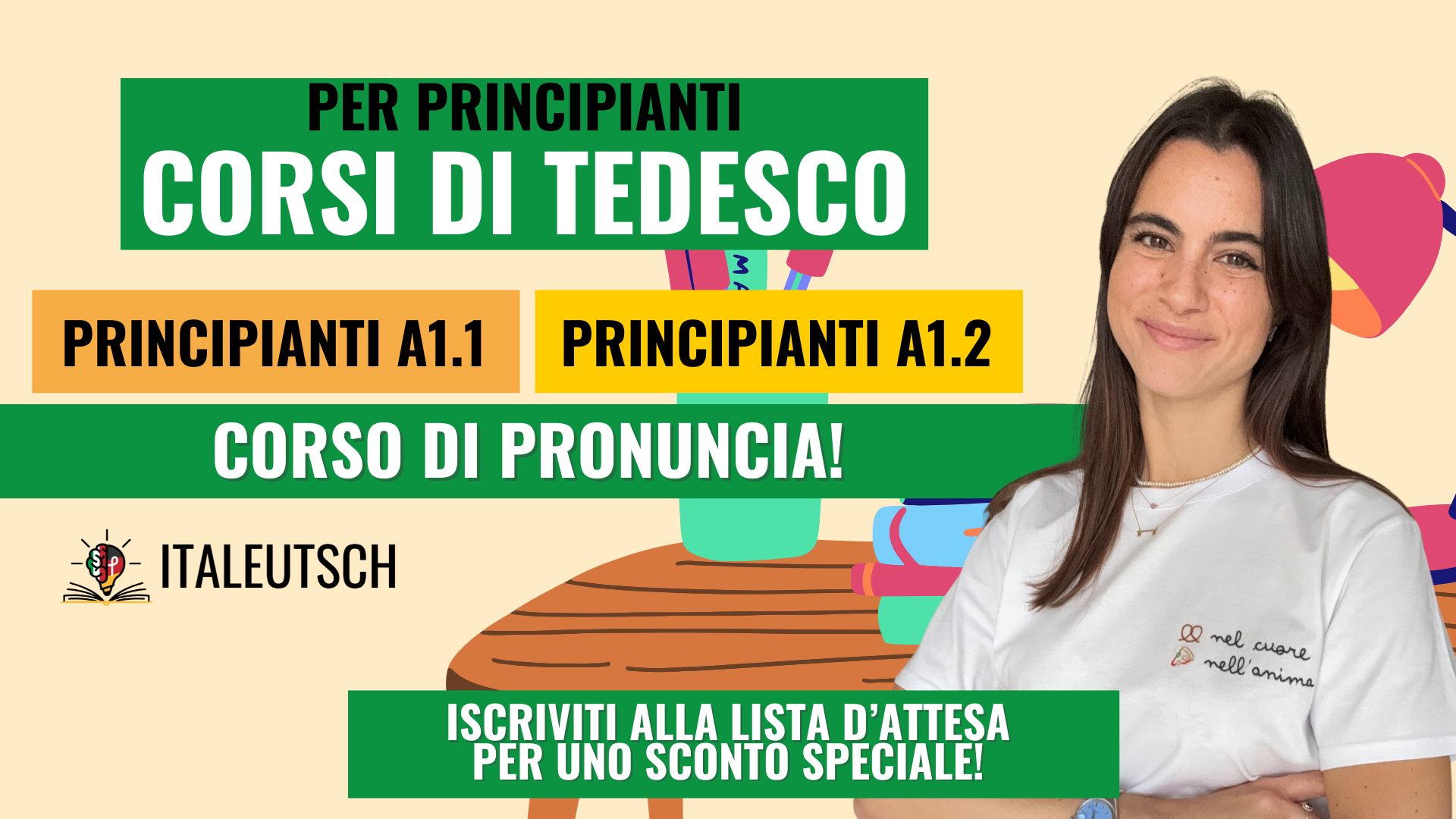 Sono felice di annunciare che le iscrizioni per il miei Corsi di Tedesco per Principianti A1.1, A1.2 e Pronuncia riapriranno presto, ed ecco la novità entusiasmante: uno SCONTO SPECIALE riservato esclusivamente a chi si unisce alla lista d'attesa!